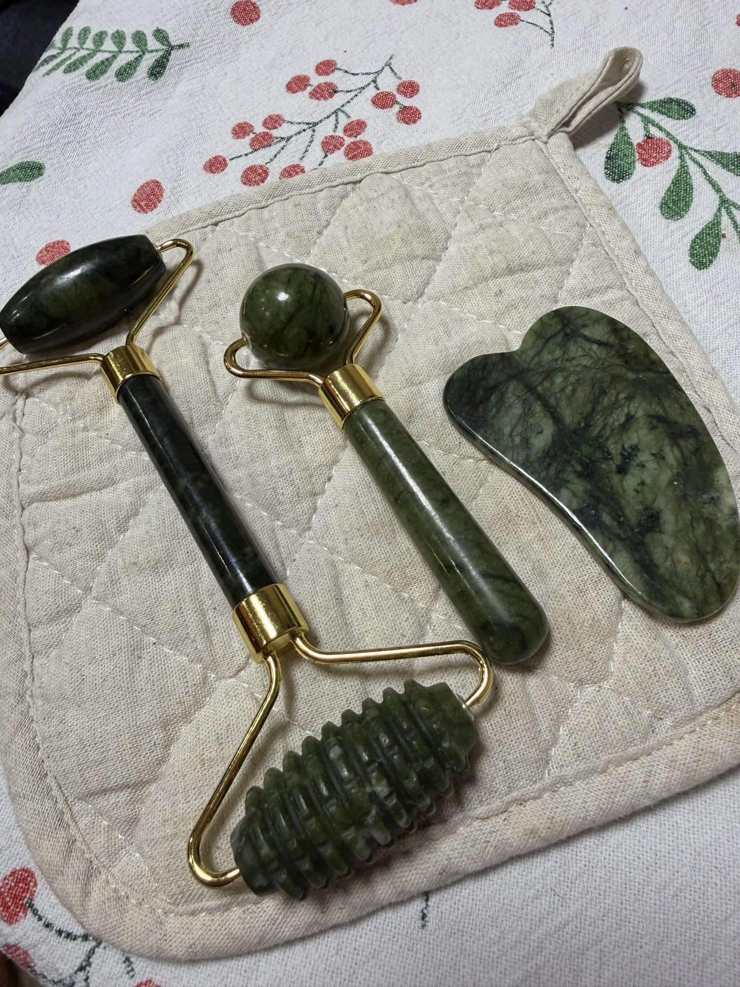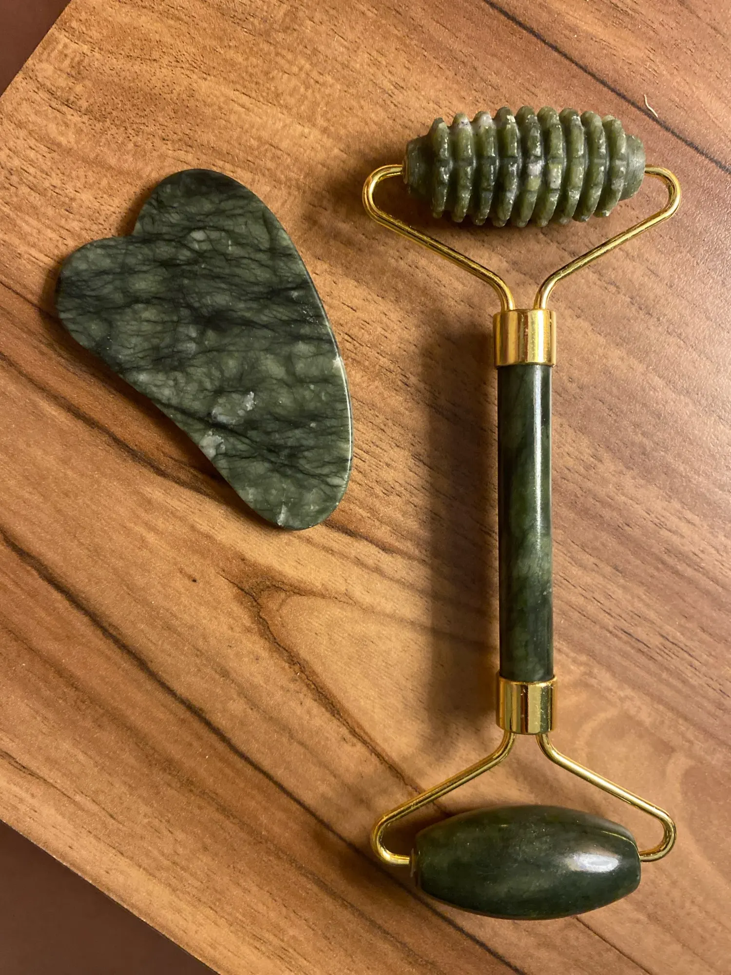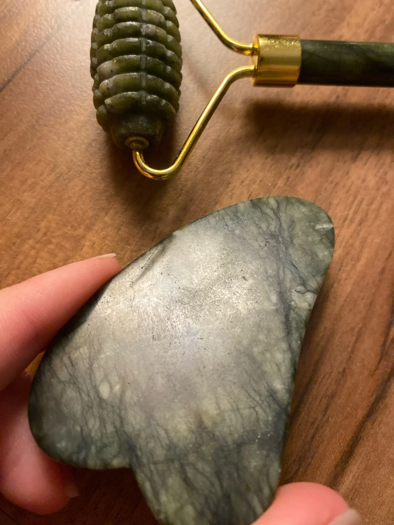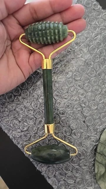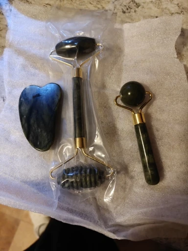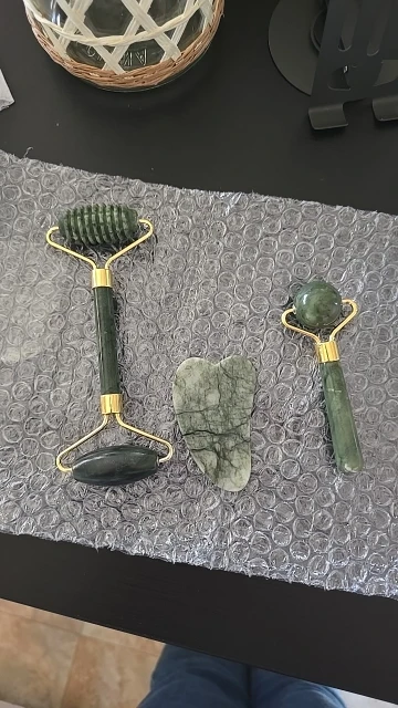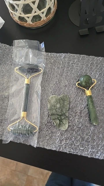Arrived quickly. It smelled like tar soap. The gua sha is matte, as if covered with something or scratched. It quickly adapts to different temperatures. Well-made, without any defects. The difference between the serrated and smooth roller is not particularly noticeable.
